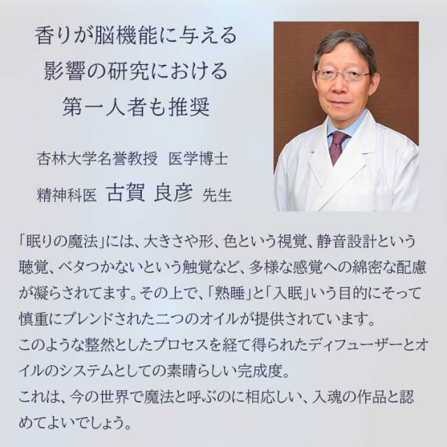- 熟睡:マンダリン、オレンジ、真正ラベンダー、マジョラム、ホーリーフ、カモミールローマン、ラヴィンサラ、リトセア