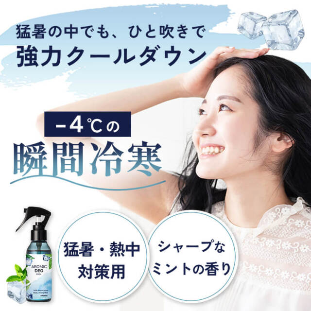 - 首・ワキ・腕など全身や、衣類・くつ・リネン類に、2〜3プッシュほど、吹きかけてください。