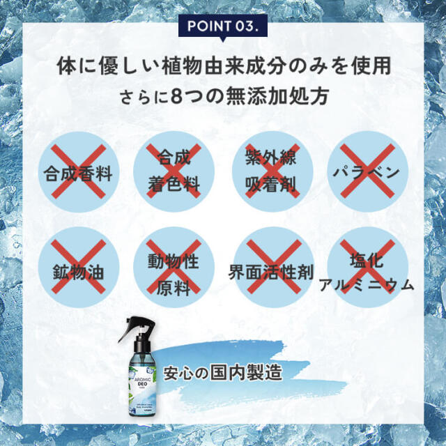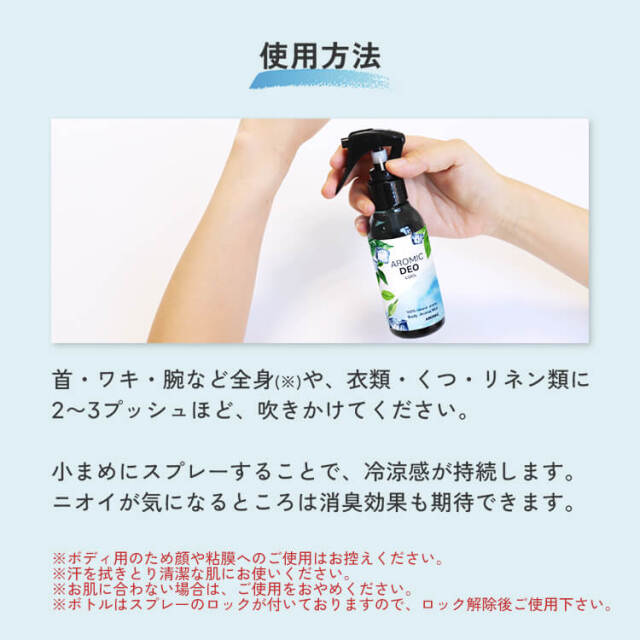 - 顔を避けて、脇の下、胸元、首すじ、腕、背中、足などに適量をスプレーしてください。※汗を拭きとってからお使いください。